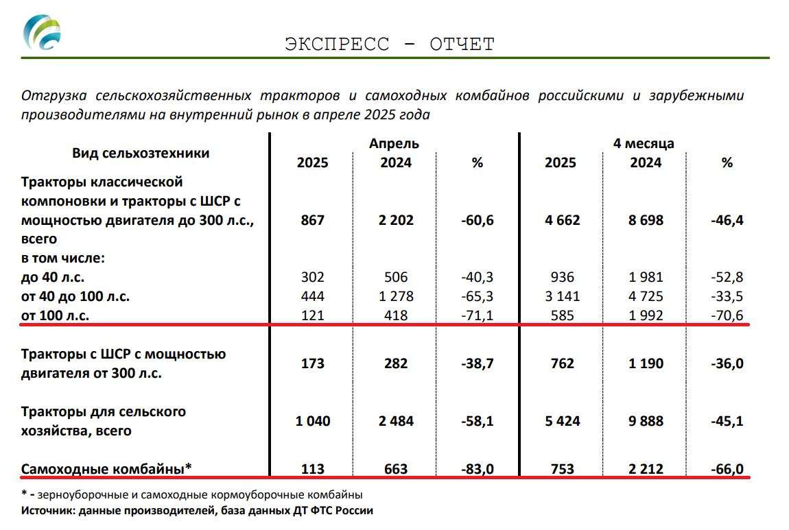 - данные из отчета Росспецмаш по отгрузкам на внутреннем рынке за первые 4 месяца 2025 года (по российским и иностранным производителям).