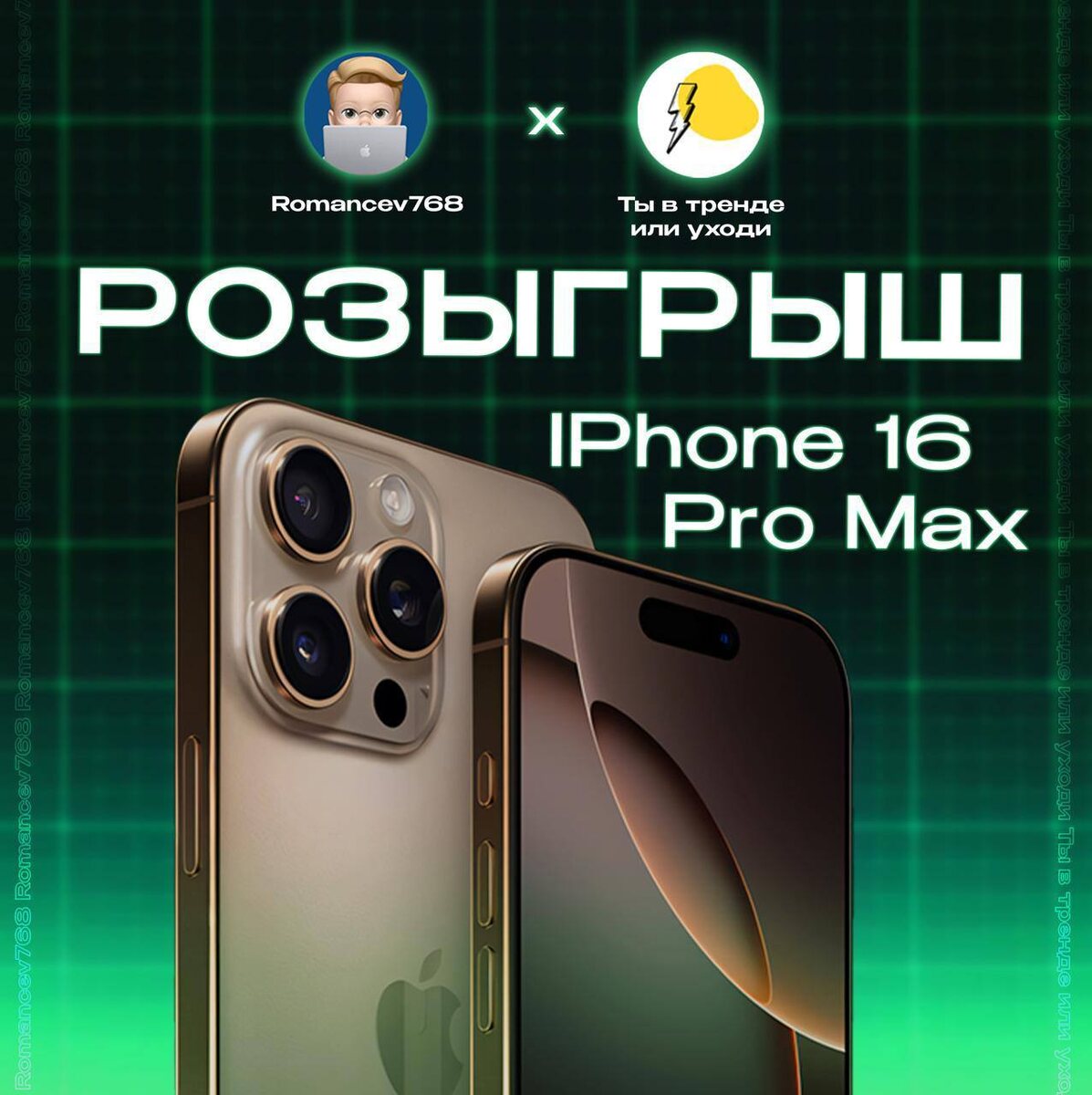 Розыгрыш 16 Pro Max! Мы не предлагаем вам витрину подарков, просто отличный смартфон - нужного вам цвета! Я с каналом @TrendSetter разыгрываю новенький iPhone 16 Pro Max 256 — победитель сам выберет его цвет. Для участия нужно подписаться на @romancev768 и @TrendSetter Нажмите кнопку «Участвовать» под постом. Итоги 30 июня в 18:00