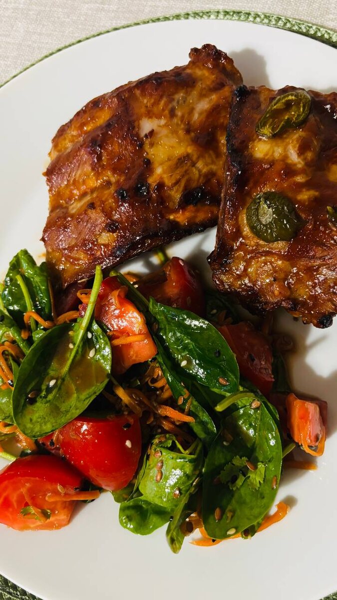 очень захотелось ребер сегодня, расскажу и вам. кто-то ребра тушит на сковородке, кто-то в духовке, а я, как хозяйственная женщина, хочу и ребра и суп, поэтому сначала их варю во имя бульона. взяла свиной патронташ, порезала на четыре части, в кастрюлю с водой на средний огонь, добавила копченую соль, сушеный чеснок, пару веток розмарина, черный молотый перец и томатную пасту. варила сорок минут, следя, чтобы не закипели, и до мягкости. потом намазала соусом: вариации здесь на ваше усмотрение, у меня терияки с лимонным соком и халапеньо на паре кусков. в духовку на 200 градусов на 10 минут, проверила как они там, и ещё на 5 минут оставила. салат к ребрам спонтанно собрался за пару минут: шпинат, спелая помидорка, кинза (ну вы помните, но тут она играет важную роль), кунжут и семечки, корейская морковка, заправлен растительным маслом, бальзамическим уксусом и соевым соусом (всех по чуть-чуть).