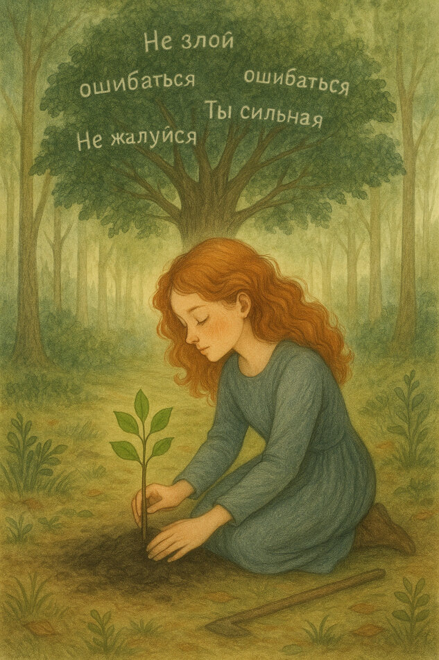 Жила-была девочка по имени Лея. Она родилась в деревне, где все люди с рождения получали своё дерево. Каждому ребёнку в день рождения выдавали росток с табличкой - на ней было написано первое правило жизни. У Леи на табличке стояло: «Ты должна быть удобной — тогда тебя будут любить». Она не понимала этих слов, когда была совсем маленькой. Но дерево росло, как и она. И с каждым годом ветви дерева шептали ей новые правила. Никто их не диктовал вслух, но Лея слышала их ясно: - Не злись - зляться плохие. - Не жалуйся - ты же сильная. - Если не заслужишь любовь, тебя оставят. - Ошибаться - стыдно. - Хочешь быть счастливой - будь идеальной. Лея стала старательной. Она угадывала чужие желания быстрее, чем они их осознавали. Улыбалась, когда хотелось плакать. Прощала, когда было больно. И даже когда сердце уставало, дерево шептало: «Ты сильная. Потерпи ещё немного. Ради них. Ради любви». Прошли годы. Её дерево стало огромным - с густой кроной, с толстыми корнями, обвивавшими её ноги, не давая