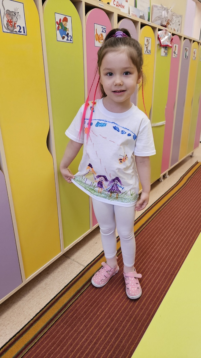 Я купила белую футболку, специальные фломастеры и дала дочке задание разрисовать футболку так, как она хочет.
