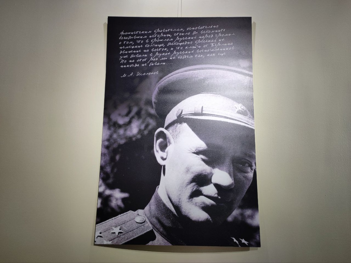 Выставка эта открылась в конце апреля - в преддверии Дня Победы. Тогда нам не случилось на неё сходить, но сегодня был день подходящий - 22 июня... Наш "Шолохов-центр" всегда готовит для зрителей выставки, которые не оставляют равнодушными. "Семь фронтов - одна жизнь" - это о военных годах Михаила Шолохова. Побывав на выставке, вы узнаете о непростой фронтовой судьбе писателя, о знакомстве с видными военачальниками, о том, как Шолохов выжил в страшной авиакатастрофе, как дважды спасал семью в войну, но не смог спасти мать от немецкой бомбы... А вы знали, что некоторые военные очерки М.А.Шолохова, который работал тогда корреспондентом "Совинформбюро" были опубликованы лишь спустя годы и даже десятилетия? Знаете, почему автору не разрешали писать об успехах Красной армии? Знаете, почему, написав рассказ "судьба человека" в 1946 году, Шолохов опубликовал его длишь спустя десять лет? Знаете, значительную часть какого своего известного произведения писатель сжёг в камине? Знаете, почему, об