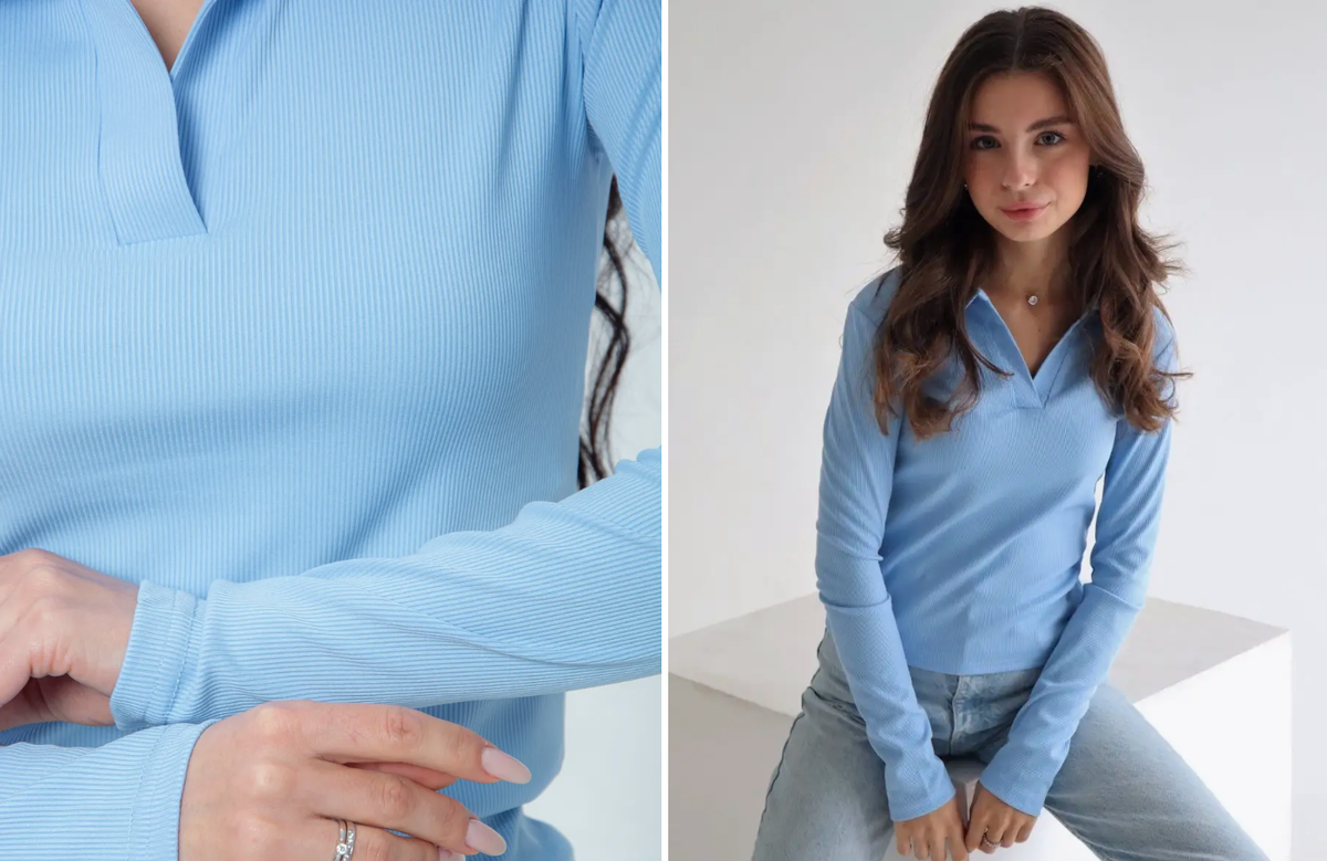 Приталенный крой подчёркивает фигуру, а небесно-голубой цвет освежает образ и легко сочетается с джинсами, юбками или классическими брюками. Воротник поло и V-образный вырез придают модели актуальность и элегантность, делая её подходящей как для офиса, так и для прогулок или встреч с друзьями.