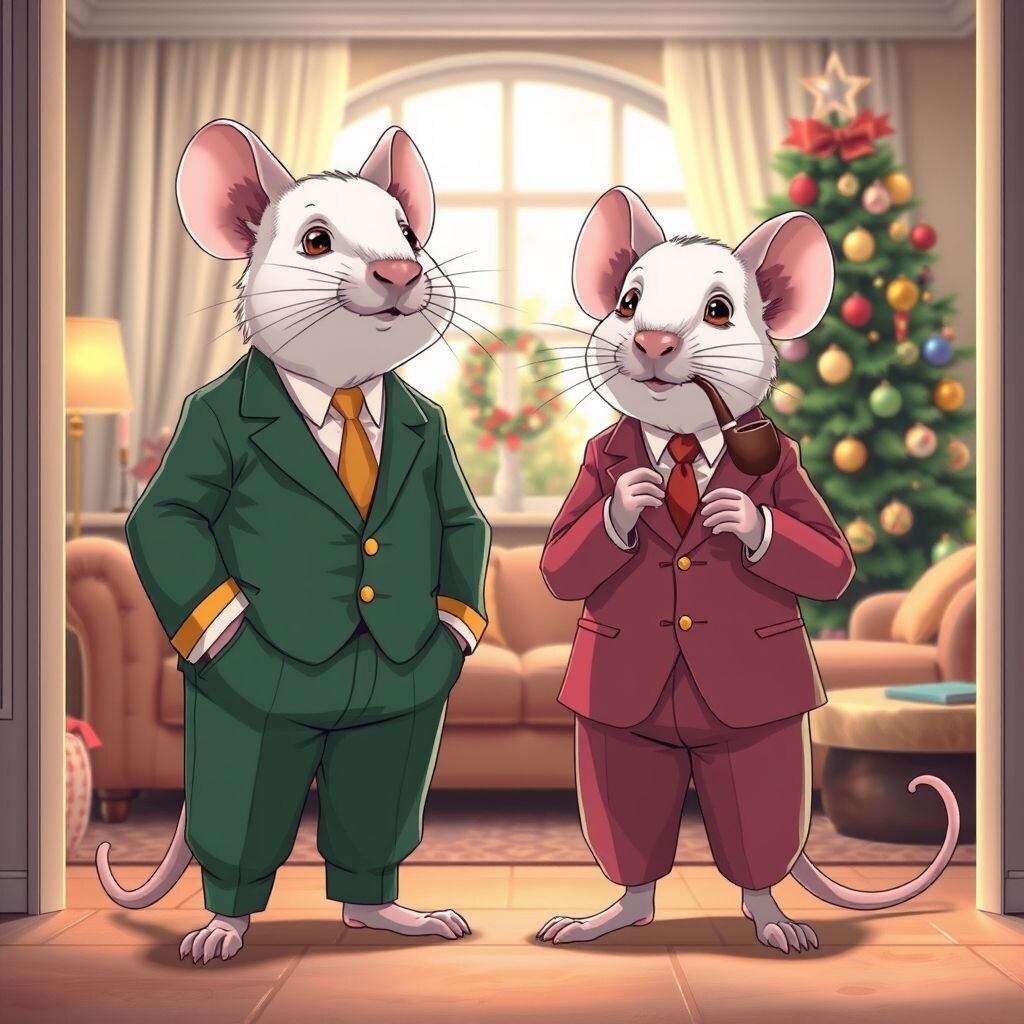 В норку в гостиной сегодня прибыли две гостьи - прекрасные дамы братьев Хиггинс, Беатрис и Эбигейл. Они весь день трудились на кухне над созданием атмосферы и съестной составляющей торжества, оформляли букеты и водрузили рождественский венок на входную дверь. Хиггинсы никогда не любили шумные вечеринки и толпы народу, это было у них фамильное, доставшееся, судя по всему, от пропавшего старого Эдварда. Они привели своё скромное жилище в надлежащий порядок и с готовностью ожидали прихода самого главного в году события. Рождество всегда приносит с собой чудеса, и это чувствуют даже мыши, в особенности те, что из благородных семей высшего сословия. Часы на большой городской башне уже вышли на финишную прямую и готовы были отсчитать последний час до наступления двадцать пятого декабря, любимого дня всего земного шара. Четверо мышей устали сидеть в норке, поэтому выдвинулись на центральную площадь, где обычно слышны колокола полуночной службы, возвещающие о начале чего-то возвышенного. Братья закутались в свои тёплые клетчатые шарфы, дамы заправили в рукава пальто длинные перчатки, и они зашагали в унисон по длинным улицам ночного города. Их путь лежал мимо бакалеи мистера Фултона, крышу которой в этом году украшал огромный сияющий ангел. Бакалейщик привёз его откуда-то из-за границы, и точно неизвестно откуда именно. На площади было всего лишь около пятнадцати человек народу, поэтому Хиггинсы и их спутницы незаметно прошли вдоль бортиков тротуаров и спрятались под окном цветочного магазина, сделавшего сегодня половину всей своей годовой выручки. Почти все цветы были проданы, и до полуночи оставалось всего пять минут, поэтому занавески на окнах были задёрнуты, а дверь изнутри заперта на тяжёлый засов.