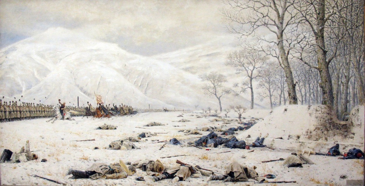 Когда готовил рецензию на картину Верещагина «Побеждённые. Панихида» наткнулся ещё на одно интересное произведение русского живописца из того же, балканского, цикла. «Скобелев под Шипкой» (1879) – не могу пройти и мимо этой картины. Надо сразу сказать, она очень скандальная. На ней не сразу найдёшь генерала Скобелева, героя той русско-турецкой войны 1877-1878 годов. Только всмотревшись, ты находишь его на заднем плане – «белый генерал» (так его называли) галопирует на белом коне и машет фуражкой строю солдат, которые, в свою очередь, бросают свои головные уборы в воздух. Всё это ты видишь, когда совершаешь усилие и вглядываешься в картину. А сначала тебе, как на пейзажах, бросаются в глаза заснеженные горы – они выпирают на полотно, а справа выступает на первый план зимний лес. И потом ты обращаешь внимание, что на опушке леса лежат скрюченные и замершие трупы солдат. Они застыли в самых неудобных позах, там где застала их смерть – один пытается ползти на карачках, другой лежит н