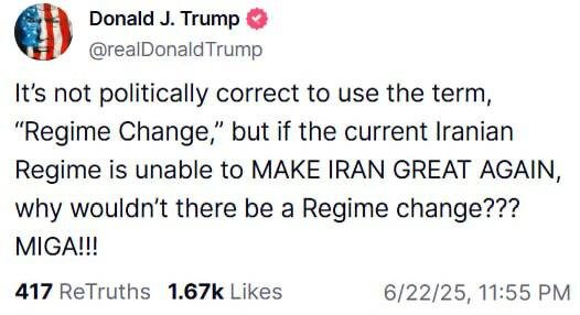 ⚡️Трамп допустил возможность смены власти в Иране «Если нынешний иранский режим не способен СДЕЛАТЬ ИРАН СНОВА ВЕЛИКИМ, то почему бы не сменить режим?»