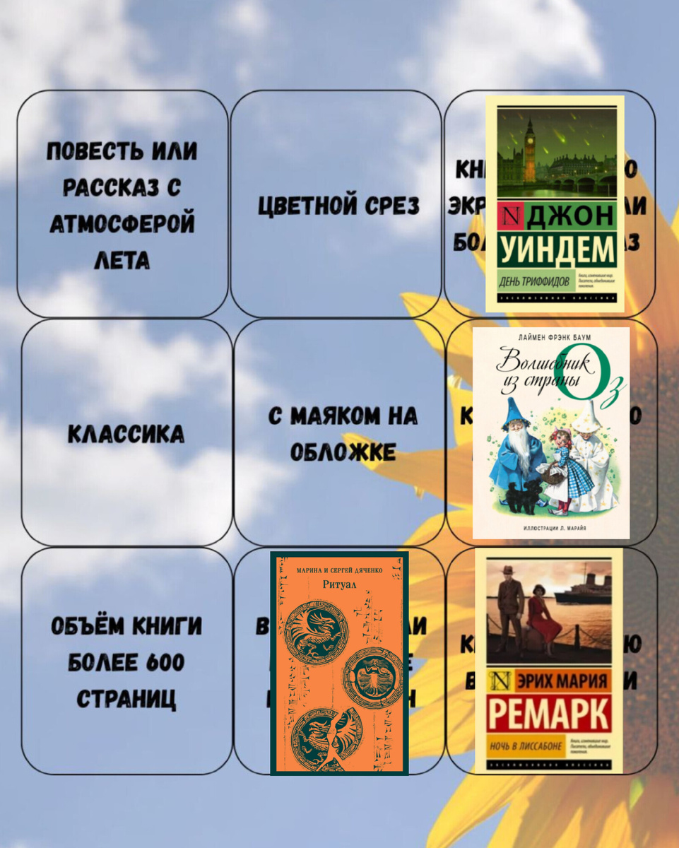 Выпала из Дзена почти на две недели, всё как то не было времени заходить, а тем более писать. Буду стараться потихоньку возвращаться. Подвожу итоги 2х недель лета по марафону: 1. Книжный бинго За две недели было прочитанно 3 книги - это мой личный рекорд💪😁 Дочитала "Волшебника из страны Оз", дальше по плану была: книга, которую подарили (или ту которую давно хотели прочесть - одно и тоже задание, на случай если нет подаренной книги). У меня не было подаренных книг, поэтому читала ту, что давно хотела "Ночь в Лиссабоне". Ремарк давняя любовь и тут всё по классике: война, гонения и преследования, любовь, буря эмоций и печальный финал. В электронном формате не нашла эту книгу и заказала, признаюсь, печатную книгу читать приятнее)) Следующим в бинго было: книга с драконом на обложке или в сюжете книги. Тут мой выбор пал на "Ритуал" Марины и Сергея Дьяченко. Я в полном восторге и с кучей впечатлений! Мне безумно понравилось, хоть и не типичный для меня жанр. На книгу есть экранизация