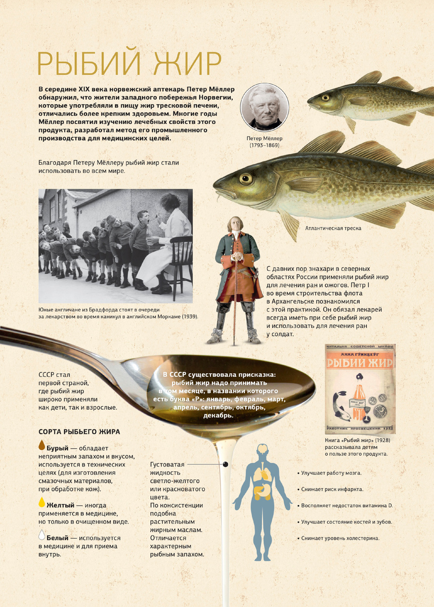 Я еще застал время, когда в детском саду нам давали рыбий жир с ложки. Невкусно, да, но и не так ужасно, как описывают. Сегодняшним детям повезло: рыбий жир отпускают в красивых капсулах без запаха. В середине XIX века норвежский аптекарь Петер Мёллер обнаружил, что жители западного побережья Норвегии, которые употребляли в пищу жир тресковой печени, отличались более крепким здоровьем. Многие годы Мёллер посвятил изучению лечебных свойств этого продукта, разработал метод его промышленного производства. Благодаря Мёллеру рыбий жир стали использовать во всем мире. Знахари в северных областях России с давних пор использовали рыбий жир для лечения ран и ожогов. Петр I во время строительства флота в Архангельске познакомился с этим применением и обязал своих лекарей всегда иметь при себе рыбий жир и использовать его для лечения ран у солдат. Доверие Петра I к целительным свойствам рыбьего жира иллюстрирует такой исторический пример: после взятия Иван-города в 1704 году царь пришел к раненым
