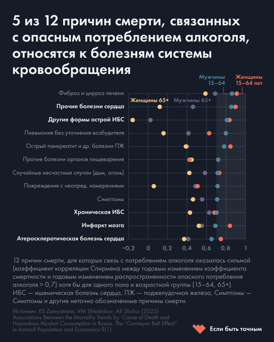 Алкоголь остается одной из главных причин преждевременной смертности в России, особенно среди мужчин трудоспособного возраста. Дело в том, что он увеличивает смертность от сердечных болезней, болезней органов пищеварения и других заболеваний. Но этим влияние алкоголя не ограничивается. Исследователи из ВШЭ и Института демографии Макса Планка изучили, как в России в 1999–2021 годах менялась смертность, непосредственно вызванная алкоголем, и от основных причин смерти. Для этого они проанализировали динамику смертности от 80 причин смерти — и вот основные результаты: ▫️Алкоголь связан с 30 причинами смерти Из 80 причин в 30 годовые колебания в уровне смертности были связаны с изменением потребления алкоголя. Самая выраженная связь — у сердечно-сосудистых заболеваний: ишемической болезни сердца, инфарктов, инсультов и атеросклероза. Из 30 причин смерти, связанных с алкоголем, исследователи выделили 12 — для них статистическая связь была самой сильной. В этих случаях динамика смертности пра