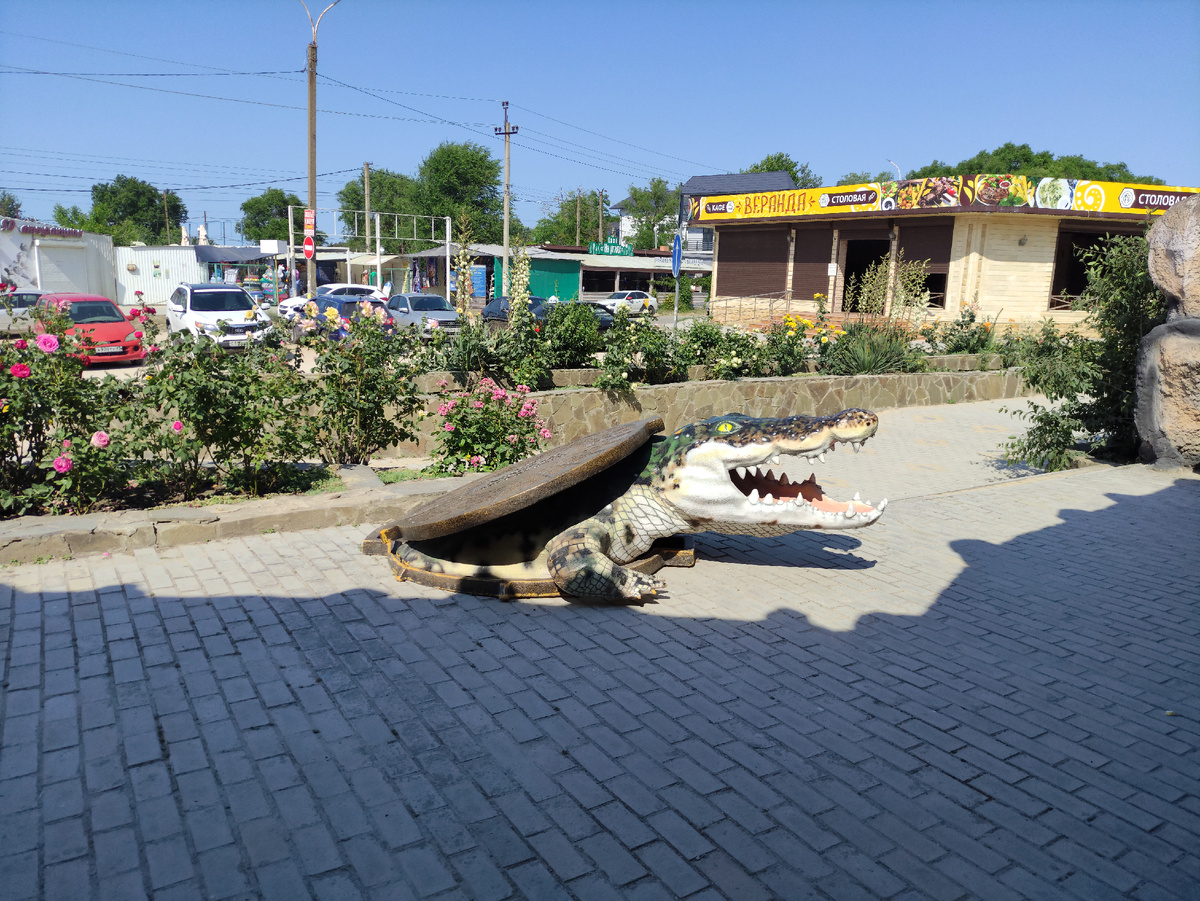 Не так давно я побывала на крокодиловой ферме. Расположена она в станице Голубицкой Краснодарского края. Это курортный уголок. Привлекательное побережье тёплого Азовского моря. Собственно, ферма стоит практически на самом берегу, рядом с пляжем. Место выигрышное - туристы мимо не пройдут. Тем более рядом и другие источники развлечений: перевёрнутый дом, мини-зоопарк с бабочками, да и общепит под рукой. В общем прямо выйдя из прогретой на солнце воды, можно отправиться в гости к дикой природе. Цены указаны на входе. И здесь же гостей встречает "киношный" аллигатор, который будто бы только что вылез из люка. Отдыхающие задумчиво прикидывают, сколько денег им нужно заплатить за всю семью. И неспешно проходят внутрь. На ферме три разных "отдела": крокодилы, пещера обезьян, птицы и еноты, фотозона. Если есть желание побывать везде придётся, купить комплексный билет. Стоит он 1200 рублей. Но можно отдать предпочтение, к примеру, лишь крокодилам. И тогда взрослый билет обойдётся в 1000 р