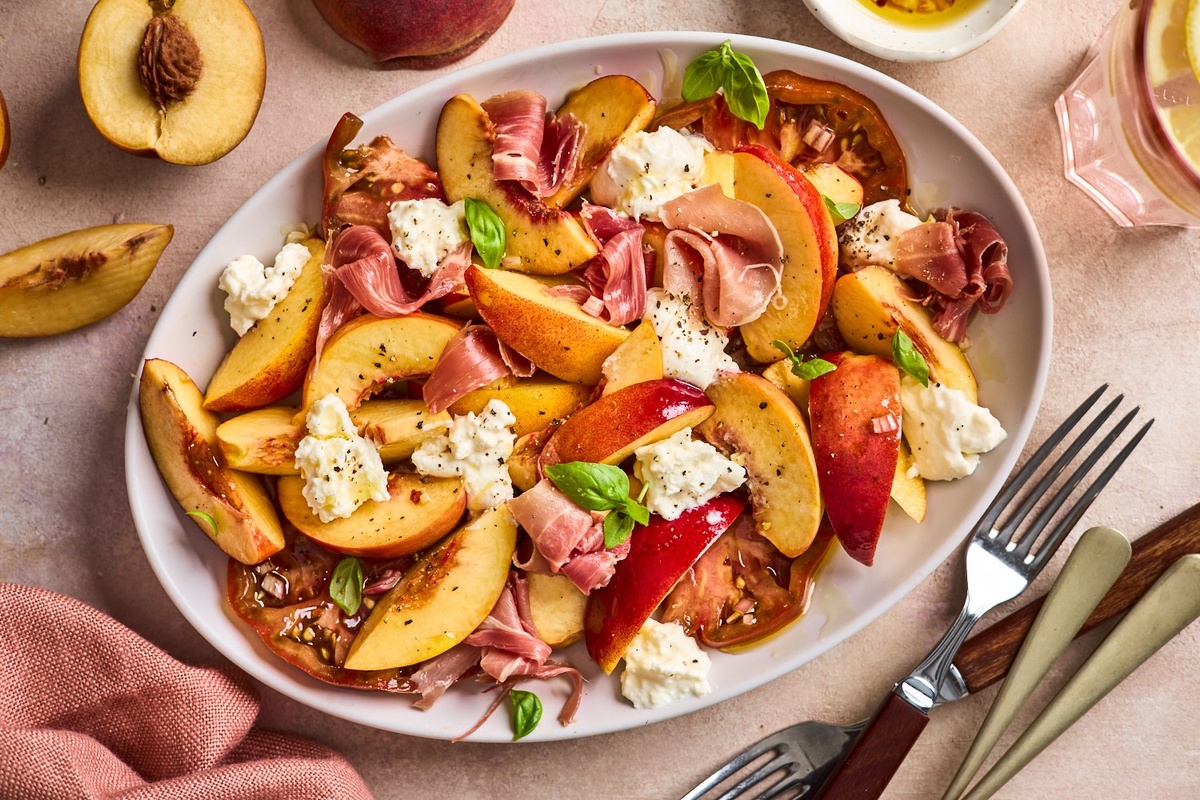 Ингредиенты для салата с помидорами, персиками и буррата