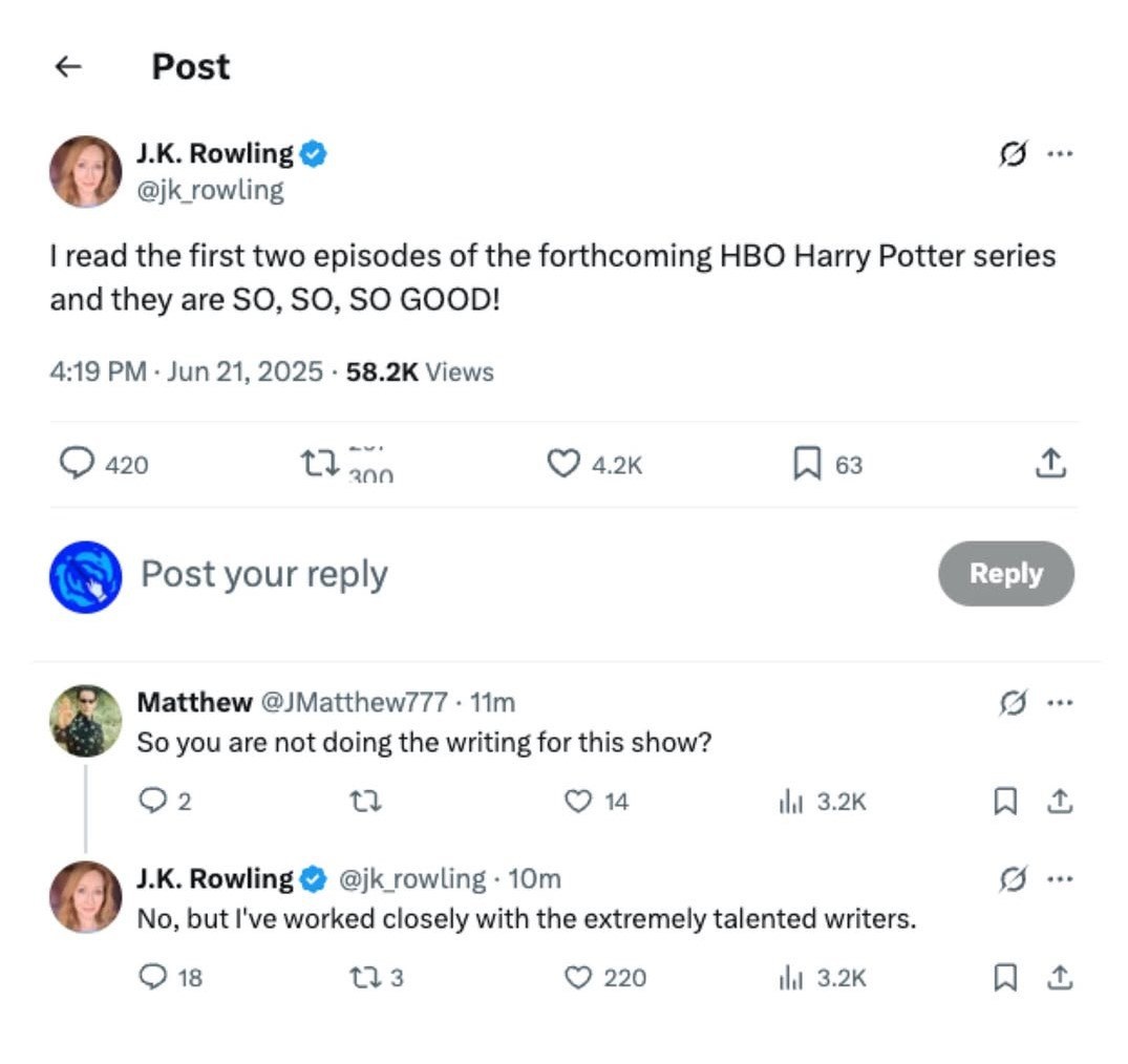РОУЛИНГ В ВОСТОРГЕ: у себя на страничке автор Гарри Поттера опубликовала пост: "Я прочитала первые два эпизода предстоящего сериала HBO о Гарри Поттере, и они ОЧЕНЬ, ОЧЕНЬ, ОЧЕНЬ ХОРОШИ!" Пользователь Мэттью у неё спросил: "То есть вы не пишете сценарий этого сериала?" На что Джоан Роулинг ответила: "Нет, но я тесно сотрудничал с чрезвычайно талантливыми писателями." 🔥 - верю 🗿 - не верю ⚡️Сериал обсуждаем ЗДЕСЬ⚡️ ❕Подписаться на Узника Косого переулка❕