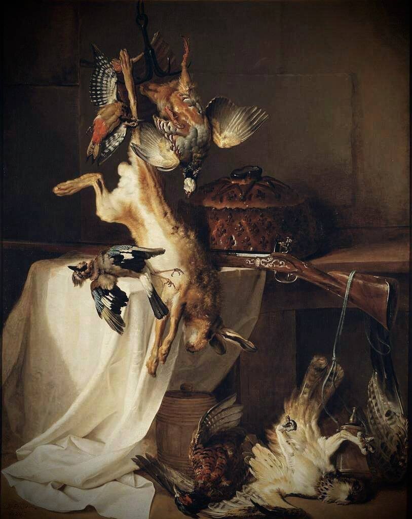 Творчество Удри было отмечено вниманием к деталям в сочетании со свободой исполнения. Мастер светотени, он поддерживал пожизненный интерес к свету и философским мотивам. Ну а как видно, на нашем сегодняшнем натюрморте художник мастерски передает богатство оттенков и фактуры различных плодов: пушистую светло-коричневую заячью шкурку, белизну сатинового полотна и гладкость ружейного приклада. Ну а больше картин художника вы можете посмотреть здесь