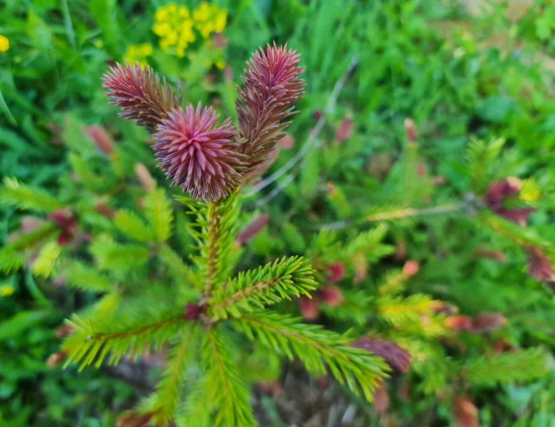 Точно такой же цикл и остальных елей с красным приростом. "Отцветающие" побеги уже не выглядят красивенькими, по цвету скорее напоминают какули: