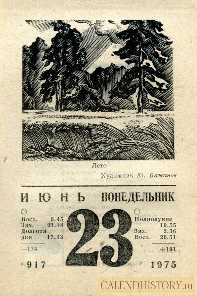 Итак, сегодня 23-го июня и у нас на календаре 1975-й год. Перед нами листок советского календаря для женщин. На календаре у нас понедельник - 23 июня 1975-го года. Лето