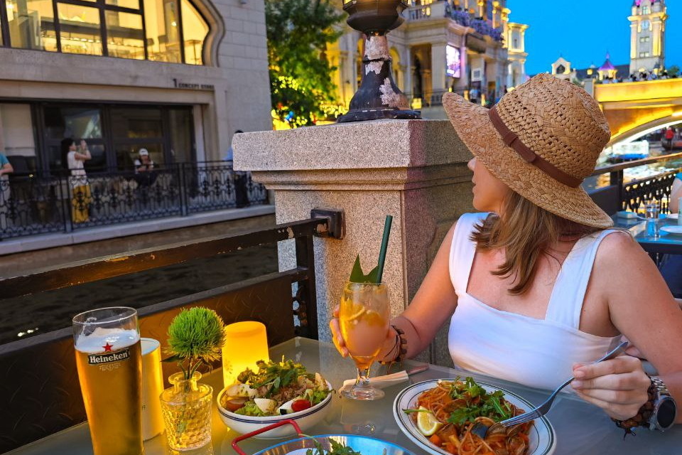 - Ресторан в «Венеции»: 233 юаня (салат, паста с морепродуктами, стейк, напитки)