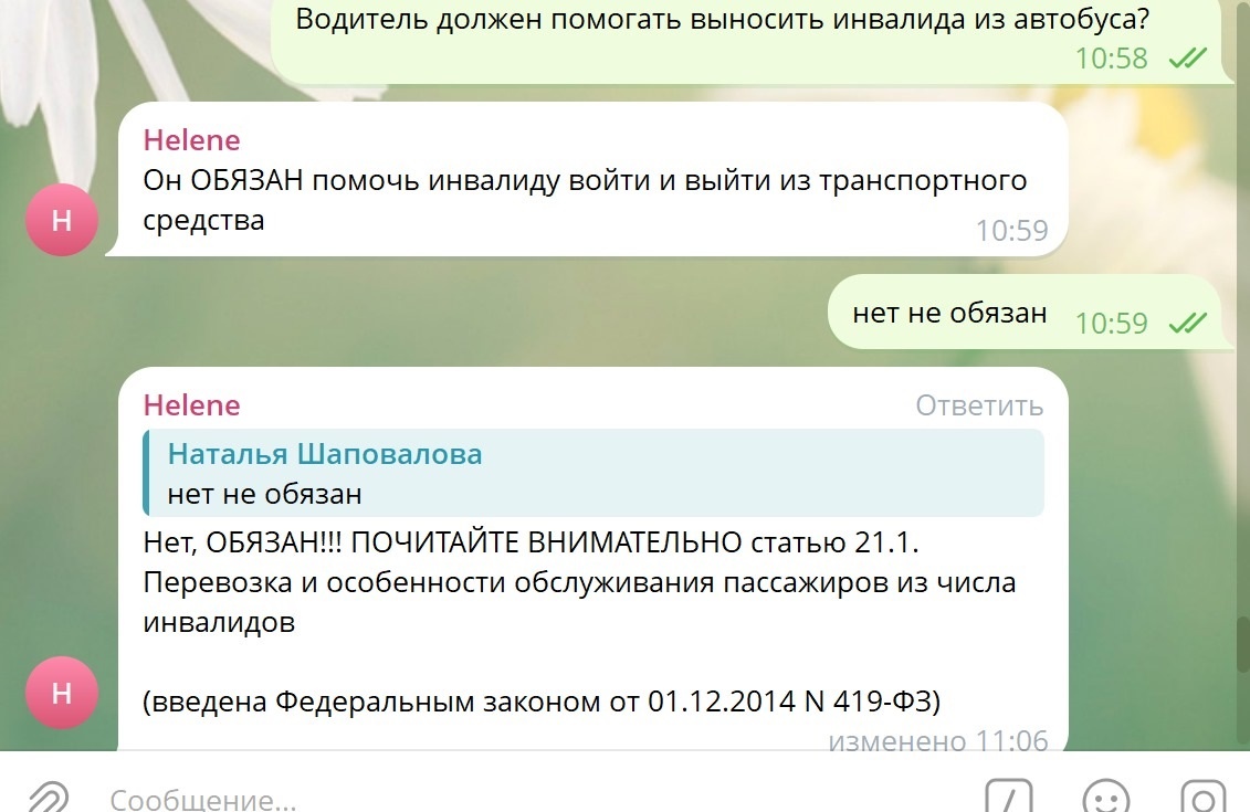 Я в одном чате инвалидов рассказала, что санаторий - хорош, а сама поездка в санаторий на автобусе со ступенями – это ужас ужасный, потому что НИКТО не помогает выйти/зайти в автобус. Если ты инвалид на коляске, тебя ждёт унизительная нервотрёпка с риском потерять здоровье. А мне в чате ответили, что водитель ОБЯЗАН помогать инвалидам. И выслали почитать УСТАВ водителей! ««УСТАВ АВТОМОБИЛЬНОГО ТРАНСПОРТА И ГОРОДСКОГО НАЗЕМНОГО ЭЛЕКТРИЧЕСКОГО ТРАНСПОРТА Статья 21.1. Перевозка и особенности обслуживания пассажиров из числа инвалидов (введена Федеральным законом от 01.12.2014 N 419-ФЗ) 1. Пассажирам из числа инвалидов обеспечиваются условия доступности их перевозки и перевозки их багажа автомобильным транспортом и городским наземным электрическим транспортом. 2. Владельцем объекта транспортной инфраструктуры обеспечиваются условия доступности для инвалидов перевозок автомобильным транспортом наравне с другими пассажирами, в том числе: 1) оборудование объекта транспортной инфраструктуры,