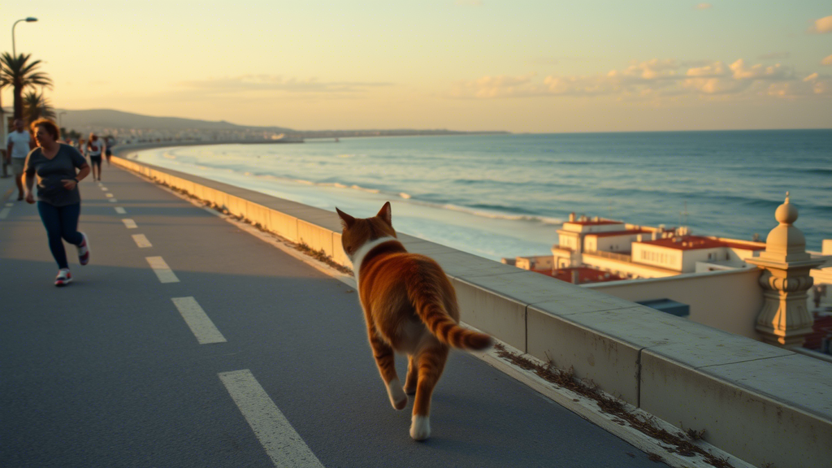 Я бежал в сторону аэропорта. Итальянец рассказал мне, где он находится. Оказалось, что это не очень далеко от моего квартала. Если все время бежать по Английской Набережной в сторону Антиба, рано или поздно упрешься прямо в аэропорт. Сначала я очень аккуратно перебежал через оживленную автомобильную магистраль с двусторонним движением, оказавшись, таким образом, на пешеходном променаде, который тянулся вдоль моря. Бежать по нему было абсолютно безопасно. Только люди, которые катались по аллее на роликовых коньках, представляли небольшую угрозу для бегущего кота. Иногда приходилось уворачиваться. Прошло уже три месяца с тех пор, как я впервые увидел девушку на улице Гуно. А еще в тот день во дворе гостиницы я познакомился с трехцветной кошкой. С милым созданием с красивыми зелеными глазами. Она сказала мне, что ее зовут Кошка. Красивое имя. Мне понравилось.