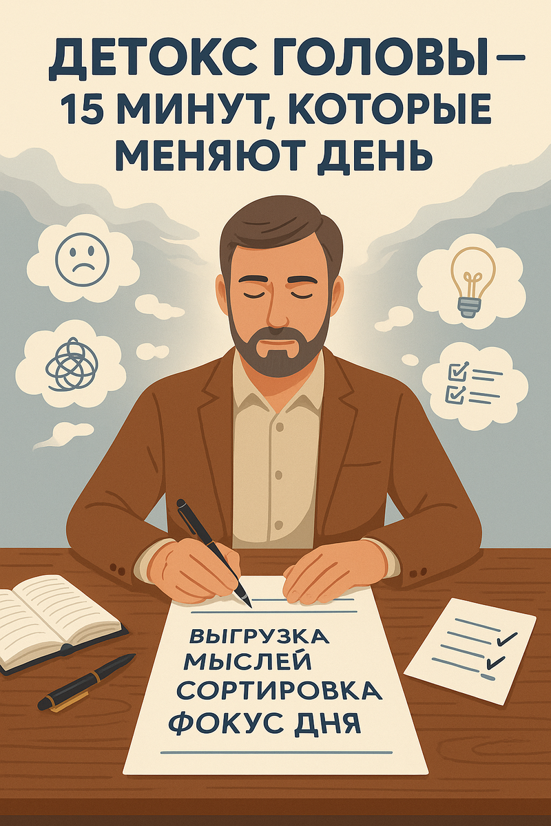 Бывает ли у вас ощущение, что голова — как переполненный ящик: мысли прыгают, идеи теряются, напряжение не отпускает даже ночью? В мире, где всё быстрее, громче и требовательнее, наш мозг становится перегруженным сервером. И как любой перегретый механизм, он нуждается в регулярной перезагрузке. Именно здесь на помощь приходит техника «Детокс головы». Простая практика, на которую нужно всего 15 минут — но результат может изменить ваш день, продуктивность и даже подход к бизнесу. Это короткая, но глубоко работающая ментальная практика, суть которой — освободить ум от лишнего, структурировать мысли и вернуть себе ясность. По сути, это своеобразная "уборка" в голове. В отличие от медитации, «детокс головы» не требует полной тишины, не предполагает сидения в позе лотоса и не требует специальной подготовки. Всё, что вам нужно — лист бумаги, ручка и 15 минут уединения. Современный предприниматель и руководитель ежедневно сталкивается с огромным количеством решений, задач, писем, звонков, пе