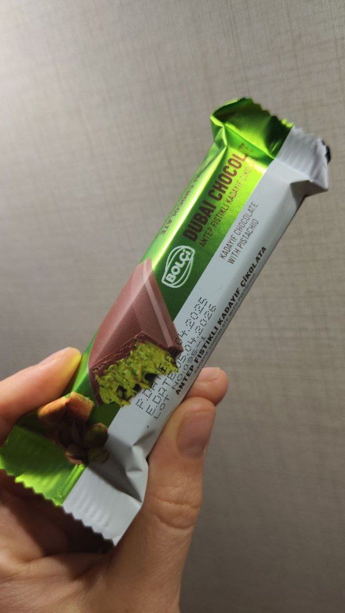 Дубайский шоколад из Турции🇹🇷 Взяла ещё одну реплику нашумевшего шоколада, но уже в #Дикси. Это тоже Турция, но изготовитель другой. Вес батончика такой же (30гр), но форма батончика другая и кажется как будто он больше, чем батончик от Elit. Мне показалось ,что и начинки как будто больше😑 Аромат фисташки чувствуется сразу после открытия упаковки, прям фисташка фисташкой. Молочный шоколад плотнее, чем у батончика из магазина #Пятерочка. Шоколадка тает в руках подольше, но не как глазурь, и тоже очень вкусная и сливочная🥛 В начинке побольше хрустяшки и поэтому лучше брать этот батончик, чем от Elit. #десерт #обзореды #вкусняшка #сладкоежка #фудблог #фудобзор #турция
