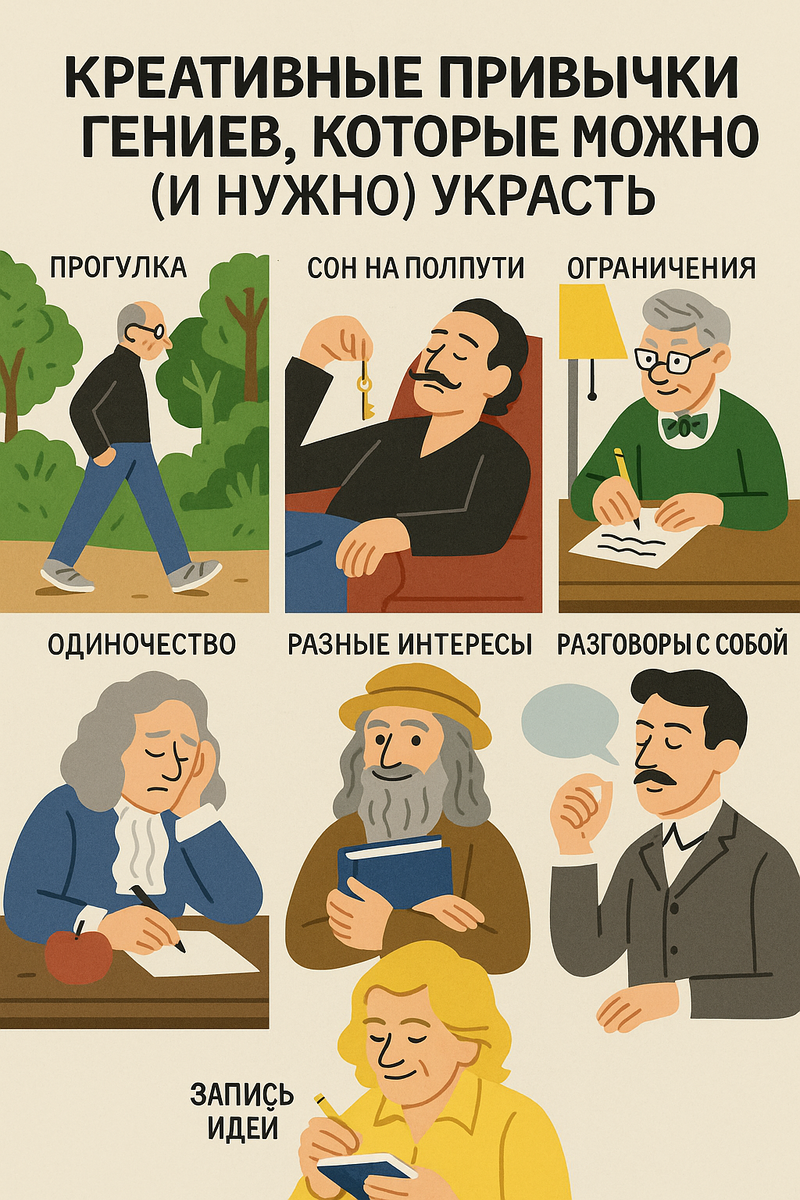Как вам идея «подсмотреть» за Эйнштейном, Стивом Джобсом или Сальвадором Дали — и взять себе на вооружение их повседневные привычки? Не обязательно быть художником, чтобы мыслить нестандартно. В бизнесе, агропроизводстве или любом проекте свежие идеи — это топливо. А креатив — это не талант, а навык. И хорошая новость в том, что его можно развить с помощью простых ритуалов, которые веками использовали гении.
