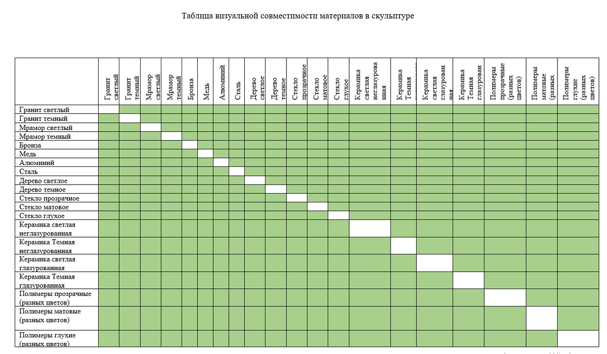Представленная таблица визуальной совместимости материалов в скульптуре демонстрирует возможные сочетания, однако некоторые комбинации могут быть проблемными из-за ряда физических и химических факторов. - Этот вывод обязывает посмотреть на таблицу визуального сочетания под другим углом, попытаться систематизировать и подробнее рассмотреть такие факторы как: