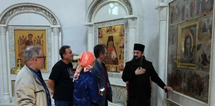 Затем челябинские действительные члены ИППО Владимир Михайлов, Василий Герман, Андрей Белопухов и автор этих строк Павел Большаков посетили мужской монастырь в 12 километрах от Алапаевска, на месте убиения Страстотерпцев. Здесь нас ждал для экскурсии наш земляк из Челябинска – схимонах Василиск (Савельев). Он открыл нам двери храмов и рассказал о византийской архитектуре церквей монастыря, показал Святую Шахту и часовенку на этом месте. Здесь 18 июля в 2 часа ночи каждый год уже тридцать лет (дата основания монастыря 22 февраля 1995 года) молятся монахи нового монастыря, что имеет огромное исцеляющее духовное значение для православных людей. Мы в этот день, 20 июня, молились у чудотворной иконы Святой Елисаветы, у нетленных мощей святителей Николая Японского и Иоанна Шанхайского, святых преподобномучениц Елисаветы и Варвары. В храме в честь Фёдоровской иконы Божией Матери (освящён Патриархом Московским и всея Руси Кириллом 16 июля 2018 года) мы молились иконе новомучеников русской церкви – святой Елисавете и святой Варваре, изображённым на одной иконе.