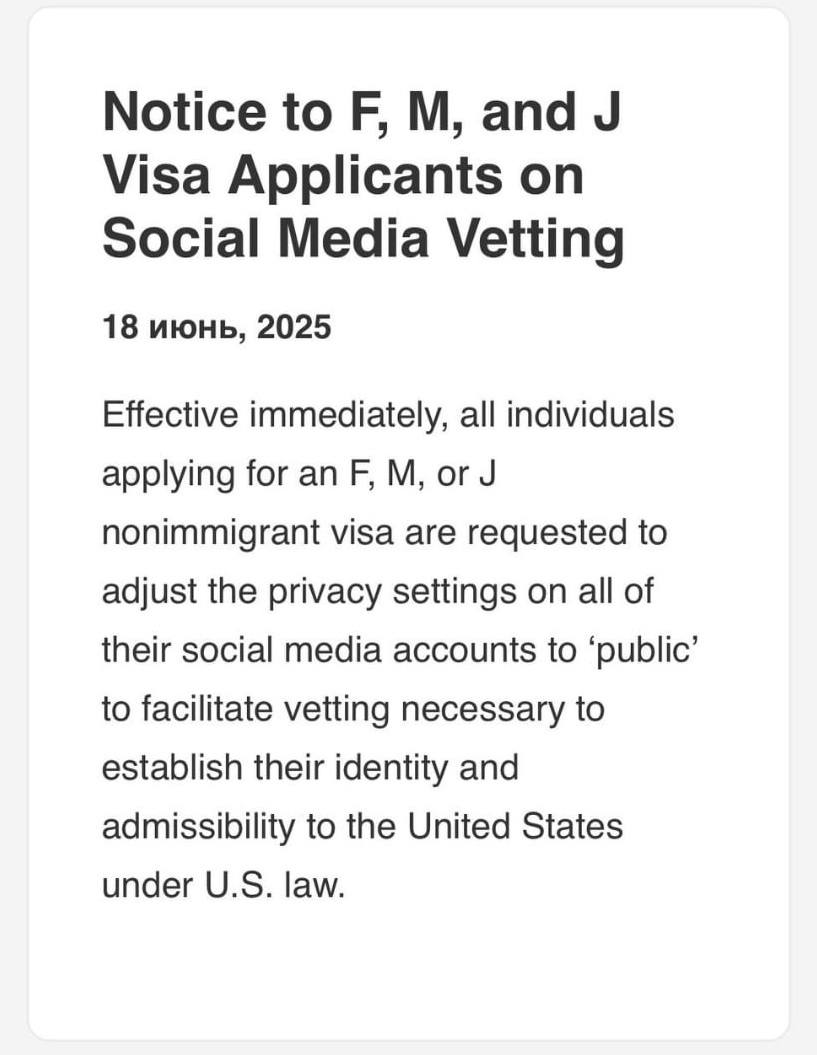 После длительной паузы консульские отделы США вновь начали назначать собеседования на студенческие визы США категорий F, M и J. О возобновлении приёма документов подробно рассказала The Washington Post, а новые правила по проверке социальных сетей - опубликовал официальный сайт посольства США. После снятия моратория появились свободные слоты, но не везде. С 19 июня 2025 года Всем заявителям на визы ➡ F, M, J предлагается открыть свои профили во всех социальных сетях 📷, чтобы облегчить проверку необходимую для установления их личности и возможности въезда в Соединенные Штаты в соответствии с законодательством США. Визовые офицеры будут использовать информацию из ваших профилей, чтобы убедиться в вашей личности и правомерности въезда в США. Проверяется не только текущее содержимое, но и ваша активность (посты, лайки, комментарии, подписки) за последние несколько лет. Вероятнее всего если заявитель случайно или намеренно не открыл социальные сети - будут назначать административную прове