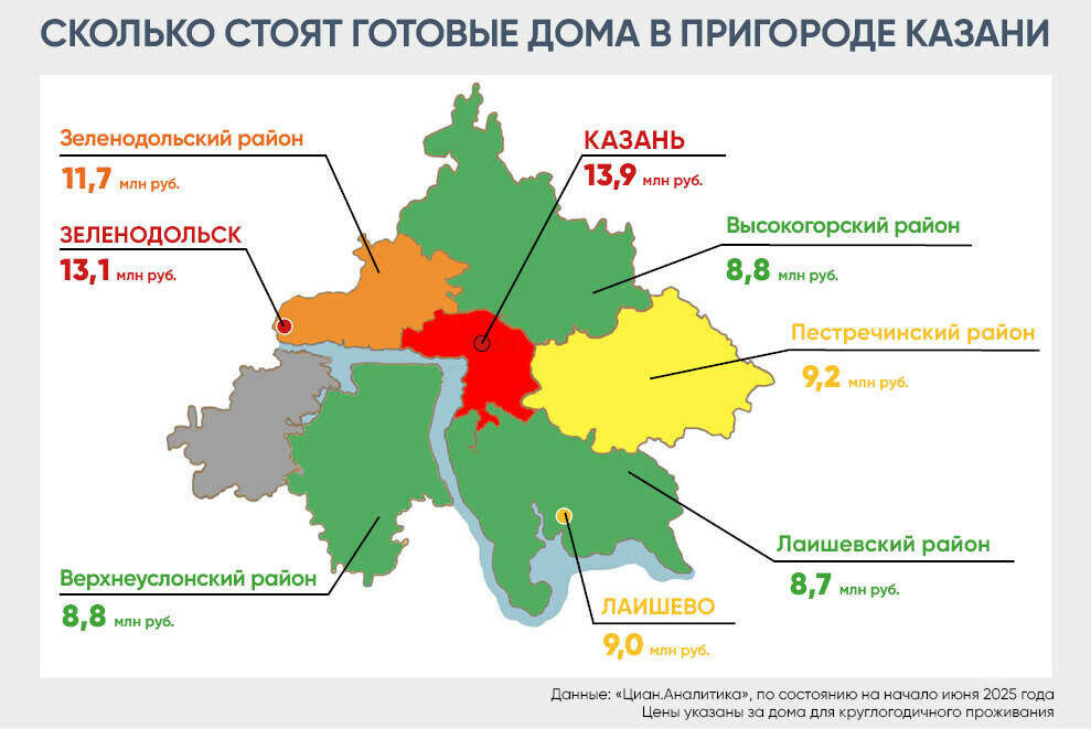 Автор: Александра Давыдова За последние пять лет цены на загородные дома в Казанской агломерации в среднем выросли на 113%. При этом динамика значительно различается в разных районах, сообщили «Татар-информу» эксперты «Циан.Аналитики». В Высокогорском районе средняя стоимость дома сейчас составляет 8,8 млн рублей. За год цены выросли на 9%, а за пятилетку – на 115%. В Зеленодольском районе дома подорожали на 109% за пять лет и на 22% за последний год. Сейчас средняя цена дома – 11,7 млн рублей. В самом Зеленодольске средняя стоимость дома достигла 13,1 млн рублей, при этом за пять лет цены выросли на 191%, а за год – на 11%. В Пестречинском районе стоимость загородного жилья увеличилась на 114% за пять лет и на 16% за год. Средняя цена дома здесь составляет 9,2 млн рублей. Одним из более доступных направлений остается Верхнеуслонский район с средней стоимостью дома 8,8 млн рублей. За пятилетку цены выросли на 80%, за год – примерно на 9%. В Лаишевском районе средняя цена дома составляе