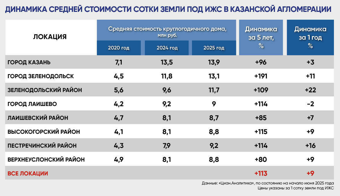 Автор: Александра Давыдова За последние пять лет цены на землю в Татарстане почти удвоились, а за последний год выросли в среднем на 9%. Об этом «Татар-информу» рассказали эксперты «Циан. Аналитики». При этом привлекательность участков в разных районах зависит от уровня инфраструктуры, транспортной доступности и близости к Казани. Лидером по темпам роста стал Высокогорский район: за пять лет стоимость сотки здесь увеличилась на 96%, достигнув 302 тыс. рублей. За последний год прирост составил 7%. Участки в этом районе привлекают покупателей благодаря хорошей транспортной доступности – до Казани можно доехать за 20 минут. Зеленодольский район также показывает уверенный рост: за пять лет – на 82%, до средней цены в 342 тыс. рублей за сотку. При этом в самом Зеленодольске скачок цен особенно заметен: плюс 181% за пять лет и 22% за последний год. Сейчас сотка в городе стоит около 667 тыс. рублей. Такой рост объясняется близостью к столице Татарстана и развитой инфраструктурой. В Пестречинс