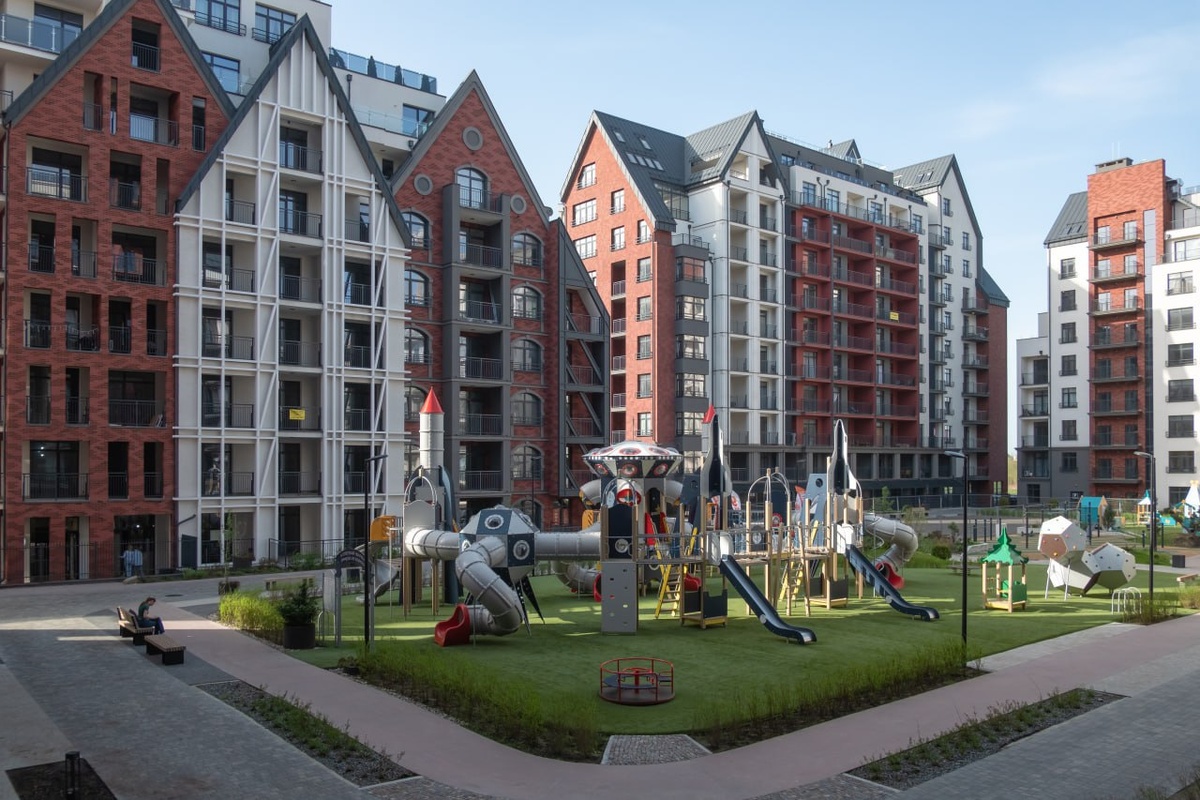Изюминка эко квартала Русская Европа - это бани и террасы в каждой квартире, панорамные лифты и эксплуатируемые кровли с изумительными видами на окрестности, закрытые дворы с оборудованными детскими и спортивными площадками, с мягким покрытием и с большим количеством деревьев и цветов.