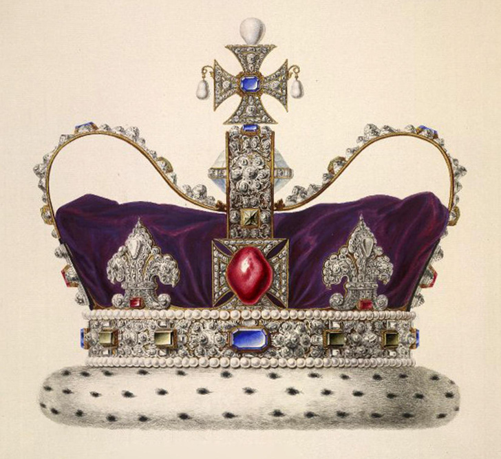 По своей форме главная корона Британской империи похожа на корону святого Эдуарда — венец узнаваемой формы с четырьмя крестами, между которыми расположены четыре геральдические лилии. Вверх над ними поднимаются полудуги, сходящиеся на шаре, который венчает крест. Внутренняя отделка — шапка из темно-фиолетового бархата с горностаевой опушкой. Корону венчают 2868 бриллиантов разного размера, 273 жемчужины, 17 сапфиров, 11 изумрудов и 5 рубинов. Роскошное зрелище! При этом данная корона, изготовленная в 1911 году для церемонии коронации Георга V, — самая легкая из всех корон Британии! Весит она всего 910 граммов. Возможно, именно за это ее больше всего любили и любят правители. Интересный факт: монарх надевает корону только перед отъездом из Вестминстерского аббатства — во время коронации венец не используется. Это украшение интересно разглядывать в том числе из-за обилия драгоценных камней, которыми оно украшено. Чего стоит один рубин Черного принца! Огромный, 34-граммовый камень разме
