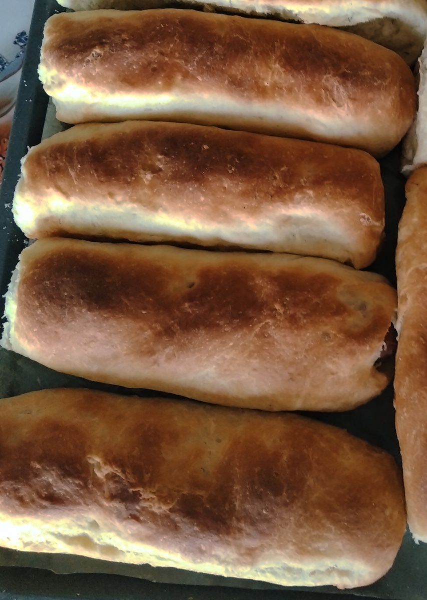 Состав: -молоко-250г. -соль-6г. -сахар-20г. -дрожжи-15г. -растительное масло-30г. -яйцо-2 -сосиски-11шт. -мука-400г. В молоке растворяем: дрожжи, соль, сахар,100г. муки и оставляем на 30 мин., затем добавляем яйца, оставшуюся муку и оставляем тесто подниматься на час. Поднявшееся тесто выкладываем из чашки на смазанный растительным маслом стол, поливаем маслом и разделываем на 10-11 частей, растягиваем каждый кусочек по длине сосиски и запаковываем предварительно очищенные сосиски, если сосисок в наличии меньше, оставшиеся заполняем любым фаршем, например толчёной картошкой. Зелень и жаренное мясо сделают картошку ещё вкуснее. Формы для сосисок в тесте я делаю из фольги, чем фольга толще-тем лучше, хотя можно обойтись без формы и выкладывать сосиски в тесте на противень, но тогда надо масло добавить в тесто в то же время, когда добавляем яйца, а раскатывать на столе с мукой и замесить тесто круче, что-бы при подъёме изделия не расплылись и не слиплись в единый пласт и муки тогд