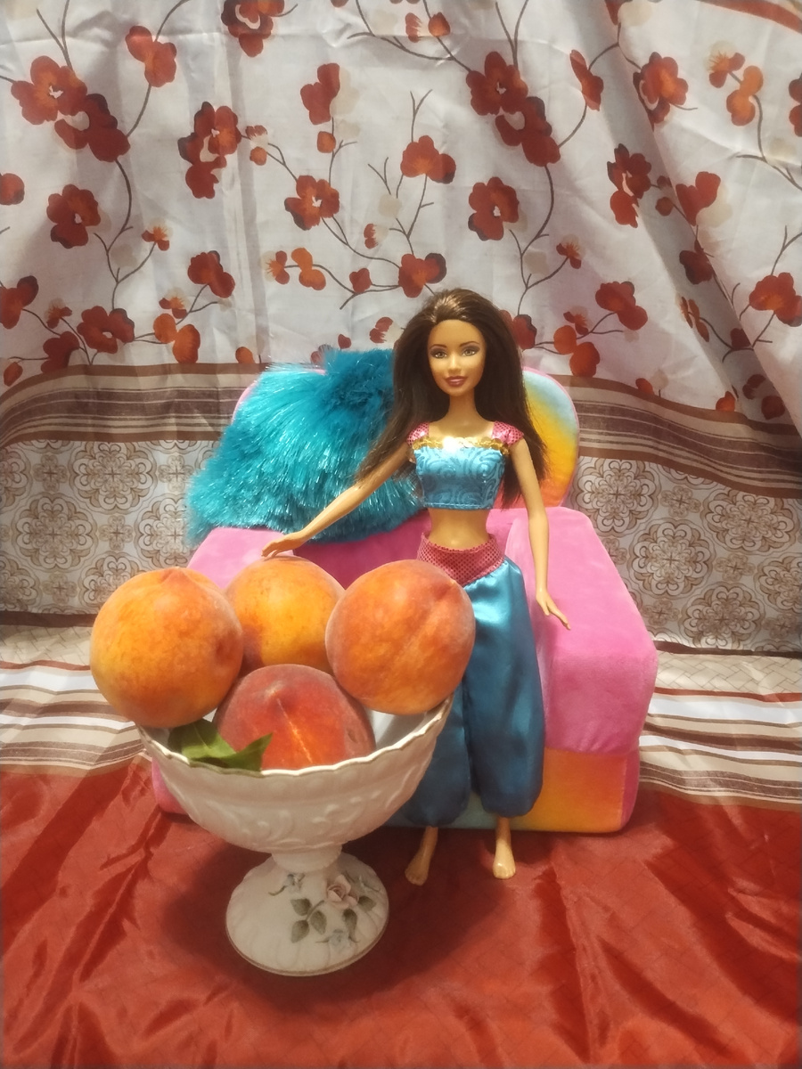 А тут пришел сезон урожая персиков. И мне пришла в голову идея сделать фотосессию персидской принцессы с персиками.