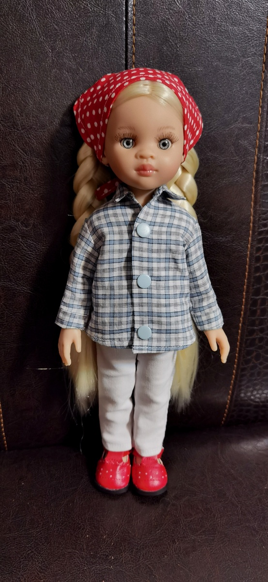 После триумфально сшитых джинсов, я почувствовала вдохновение и приступила к изготовлению самого сложного для меня предмета кукольного гардероба - рубашке. Ранее, встречая в статьях сохоббитов рассказы о шитье рубашек на барби, я неизменно проникалась уважением к этим людям, так как создавать такие миниатюры, да еще и с большим количество деталей в районе воротника, представлялось для меня швейным подвигом. Но...глаза боятся, а руки делают. Тем более, что готовые выкройки есть, ничего строить не надо. Подобрала подходящую ткань в милую клеточку - и вперед. Вот что у меня получилось. Вид спереди: Вид сбоку: Вид сзади, кому интересно Самым сложным оказался действительно воротник, с остальными деталями мороки не было. Я шила эту рубашку по выкройкам из книги "Шьем одежду для Паола Рейна" и тем, кто так же будет пробовать по ней шить, могу посоветовать не отступать от предлагаемых размеров - как самих деталей, так и припусков на швы. Дело в том, что выкройки настолько точно выверены и п