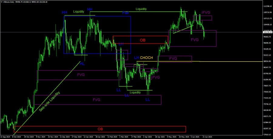 https://basechop.ru/wordpress/?p=47399 Биткоин так и не смог преодолеть область 110 000$ – 112 000$ и начал второй коррекционный заход, что отлично видно на дневном ТФ. На 4-часовом ТФ был получен отличный сигнал на продажу в виде отработки «медвежьего» FVG со снятием ликвидности на продажу. После этого был снят целый пул ликвидности на покупку, но никакой реакции быков не последовало. Напомним, что снятие ликвидности отличается от пробоя и преодоления тем, что цена лишь «собирает» Stop Loss(за важными уровнями, линиями тренда и другими техническими ориентирами), а затем быстро разворачивается. В нашем случае цена после снятия ликвидности с пула никакого разворота не показала. Поэтому падение продолжилось. Сейчас ситуация очень интересная. Во-первых, в ходе последнего падения сформировалось два новых «медвежьих» FVG. В ближайший цена уже вернулась, поэтому сегодня может последовать разворот и новое падение. Если этот FVG будет проигнорирован, то обратить внимание следует на дневной ТФ
