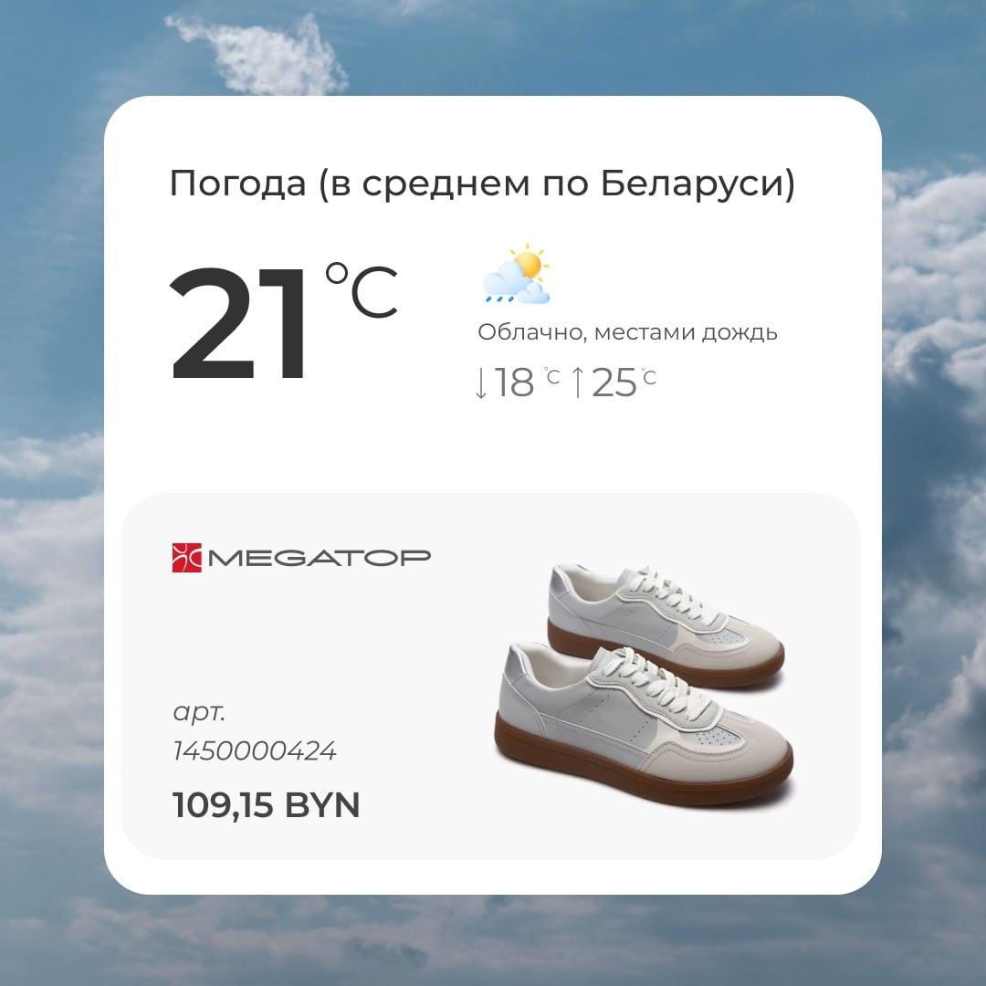 MEGAпрогноз погоды на 23 июня⛅ Сегодня мы продолжаем ждать настоящее лето с максимальной температурой воздуха днем +18…+25 °C и возможными осадками! А чтобы ожидание было приятным - выбрали для вас стильную пару кед в оттенке неба сегодняшнего дня😅 Всем продуктивного начала недели💖