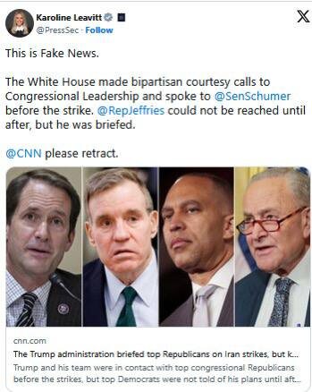 Leavitt asks CNN to retract claim Trump didn't follow procedure to bomb Iran