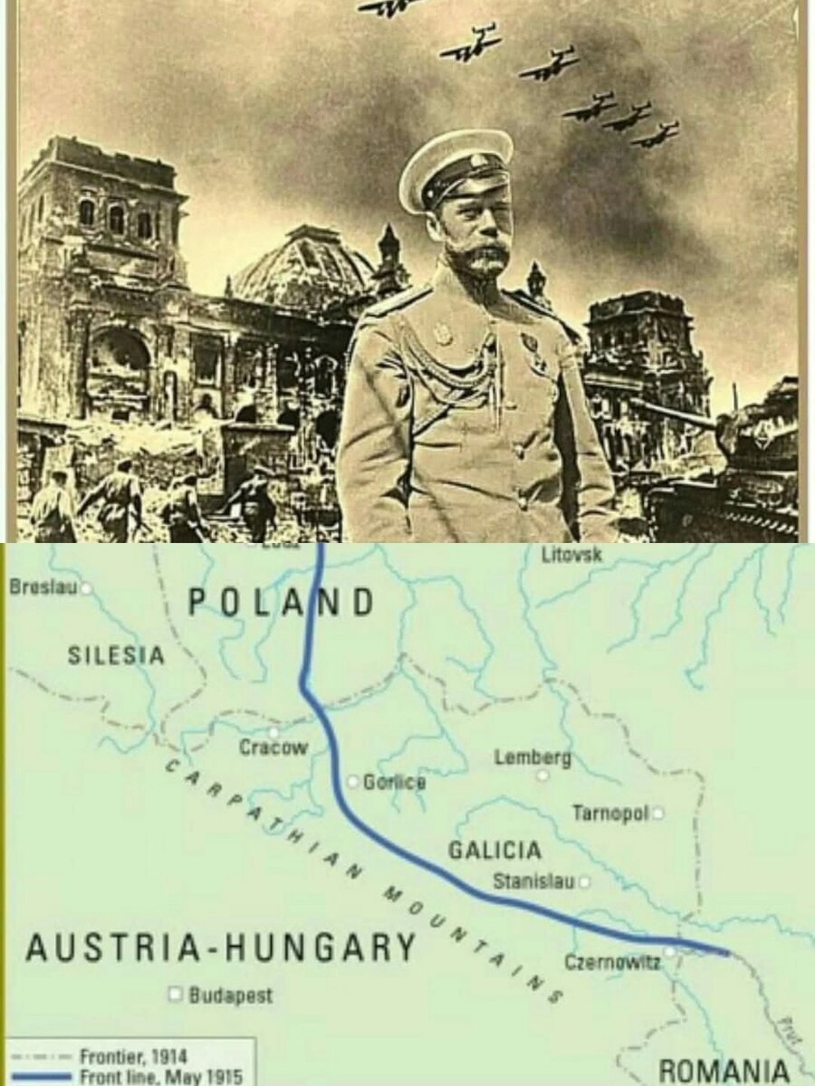 Война 1941-45 гг. явилась продолжением Мировой войны 1914 -1918 гг. В марте 1917 г. Российская Империя стояла на пороге окончательной победы. За время той войны завоевателю удалось дойти лишь до границ Царства Польского (показано на карте), ч т о́ является уникальным случаем в истории подобных великих войн.