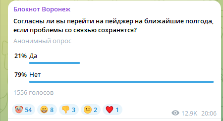 Подводим итоги опроса среди подписчиков нашего телеграм-канала. В последние дни мобильный интернет и связь на территории Воронежа работают нестабильно. У этого есть свои причины. И местные жители учатся справляться с этим – ищут места с Wi-Fi, чтобы выйти во Всемирную сеть, списаться с близкими или позвонить друзьям. В связи со всеми ограничениями «Блокнот» спросил у своих подписчиков в телеграм-канале: «Согласны ли они перейти на пейджер, если проблемы со связью сохранятся?» В опросе приняли участие 1,5 тыс человек. И большинство из них (79%) не готовы к таким мерам. А вот 21% уже бежит покупать пейджеры готов перейти на пейджеры. Добавим, в региональном правительстве заявляли, что «решения об отключении мобильной Сети по конкретным территориям принимаются компетентными структурами исключительно в зависимости от оперативной обстановки». Ранее специальный корреспондент «Блокнот Воронеж» Виктория Воротникова спрашивала у прохожих, как они справляются с ограничениями мобильного интернета