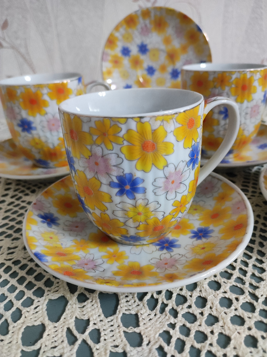 Всем доброго времени суток !! Продолжаю показывать покупки и подарки июня. Сегодня решила, что будет два статьи, эта тоже про фарфор с блошиного рынка Ржева. Фарфора там было не много, но мы с дочкой кое что всё же купили (уже показала) и не только фарфор, но об этом в следующей статье. Сегодня покажу фарфор и немного повеселю вас) Как я уже писала, фарфора было немного, вернее совсем мало того, что можно было купить. Если бы я туда попала год назад, то ушла с большой коробкой всяких советских чашечек, чайников и сахарниц, но сейчас я уже выбираю и покупаю более осознанно. Так вот, купила мне Алёна сливочник, конфетницу, чайные ложечки и тут её взгляд выловил яркие жёлтые чайные пары , на которые я не обратила внимание, так как подумала, что они современные. Она посмотрела клеймо, говорит - Кузнецов, спросили цену, продавал молодой мужчина, ответил - 200 рублей. А я же без очков, рассмотреть клеймо толком не удалось, в общем купили 5 чайных пар плюс блюдце за 1000 рублей. Уже дома, в о