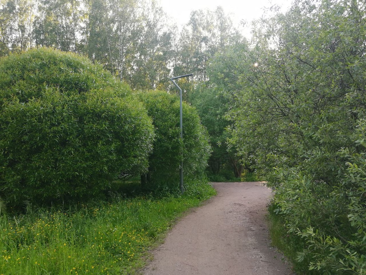 Я неспешно шла по тропинке, наслаждаясь тишиной и прохладой после жаркого дня. В воздухе витал свежий запах трав и цветов, а где-то высоко в кронах деревьев пели птицы, добавляя мелодию к этому природному концерту. Одинокий фонарный столб стоял на страже, готовый зажечь свет, когда наступят сумерки, чтобы освещать путь тем, кто решит прогуляться здесь вечером.🌙🚶♀️