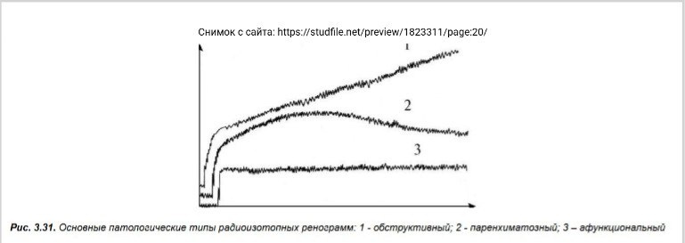 Динамическая нефросцинтиграфия. Часть 2. Патологические типы ренограмм. 1. Обструктивный тип: Характеризуется подъемом кривой, который продолжается на протяжении всего времени исследования, без выраженной фазы экскреции. Это говорит о нарушении оттока мочи из почки, например, при мочекаменной болезни, стриктурах мочеточника или опухолях. Наиболее часто встречающийся тип патологической ренограммы. 2. Паренхиматозный тип: Отличается замедленным накоплением и выведением радиофармпрепарата (РФП), соответственно, со снижением амплитуды ренографических кривых. Кривая имеет уплощенный вид, с медленным подъемом и отсутствием четкой фазы экскреции. Этот тип характерен для заболеваний, поражающих ткань почек, таких как гломерулонефрит, пиелонефрит, диабетическая нефропатия. 3. Изостенурический тип (одна из разновидностей паренхиматозного типа): Кривая имеет низкую амплитуду, все фазы ренограммы удлинены, но ещё различимы. Встречается в более запущенных стадиях поражения почек. 4. Рефлюксный