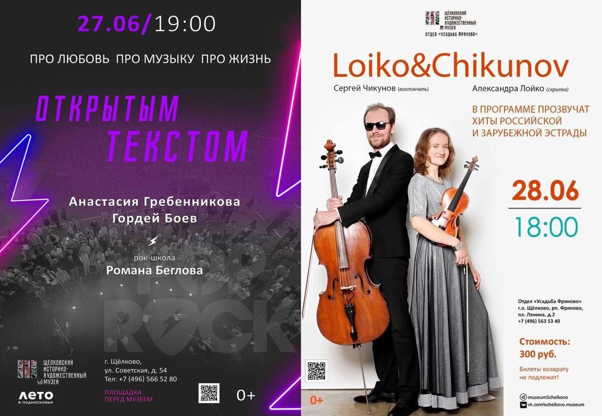 ⭐️ 28 июня, 18:00 – концерт «Loiko & Chikunov». Александра Лойко и Сергей Чикунов исполнят для вас популярные композиции российской и зарубежной эстрады на скрипке и виолончели.
