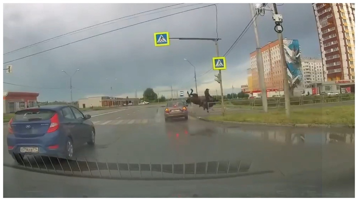В городе Магнитогорске Челябинской области на улице Зелёный лог произошло ДТП с участием всадника верхом на лошади и легкового автомобиля. Водитель на серой Lada Granta сбил коня и его «пассажира» во время того, как они переходили (или переезжали) проезжую часть по регулируемому пешеходному переходу. Судя по всему, он, в отличие от других водителей, не заметил лошадь. Видеозапись аварии выложили в городском паблике. На кадрах чётко видно, как автомобиль сбивает лошадь, та вместе с верховым кувыркается в воздухе и падает. Конь сразу после встаёт на ноги и покидает место событий, оставив своего всадника. Мужчина же продолжает лежать на асфальте. К сожалению, на видео не разобрать, на какой свет светофора всадник на лошади пытался пересечь проезжую часть. Ранее мы писали о грабеже, закончившимся дракой и ДТП. Марина Злобина