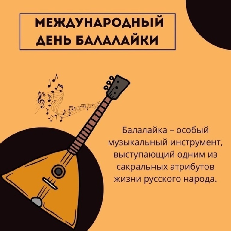 😍 23 июня – Международный день балалайки 🎶 Балалайка — символ народной культуры, искренности и веселья. Её трели переносят нас в бескрайние поля, на шумные ярмарки и в душевные вечера у самовара. Пусть этот день напомнит нам, как важно беречь традиции, гордиться своими корнями и находить гармонию в простом. Послушайте балалайку — и вы услышите историю! Вот несколько интересных фактов о балалайке, которые точно удивят даже тех, кто с ней знаком: 🎼 Балалайке более 300 лет, но её официальный «паспорт» появился лишь в XIX веке, когда мастер Василий Андреев начал развивать балалаечную традицию и создал первый оркестр народных инструментов. 🔺 Треугольная форма — визитная карточка балалайки. Считается, что такая форма облегчает игру и делает звук более звонким и чётким. 🎵 У балалайки всего три струны. Однако благодаря особой технике игры, она может звучать как целый ансамбль — особенно в руках опытного музыканта. ❤ Семейство балалаек насчитывает 6 разновидностей — от самой маленьк