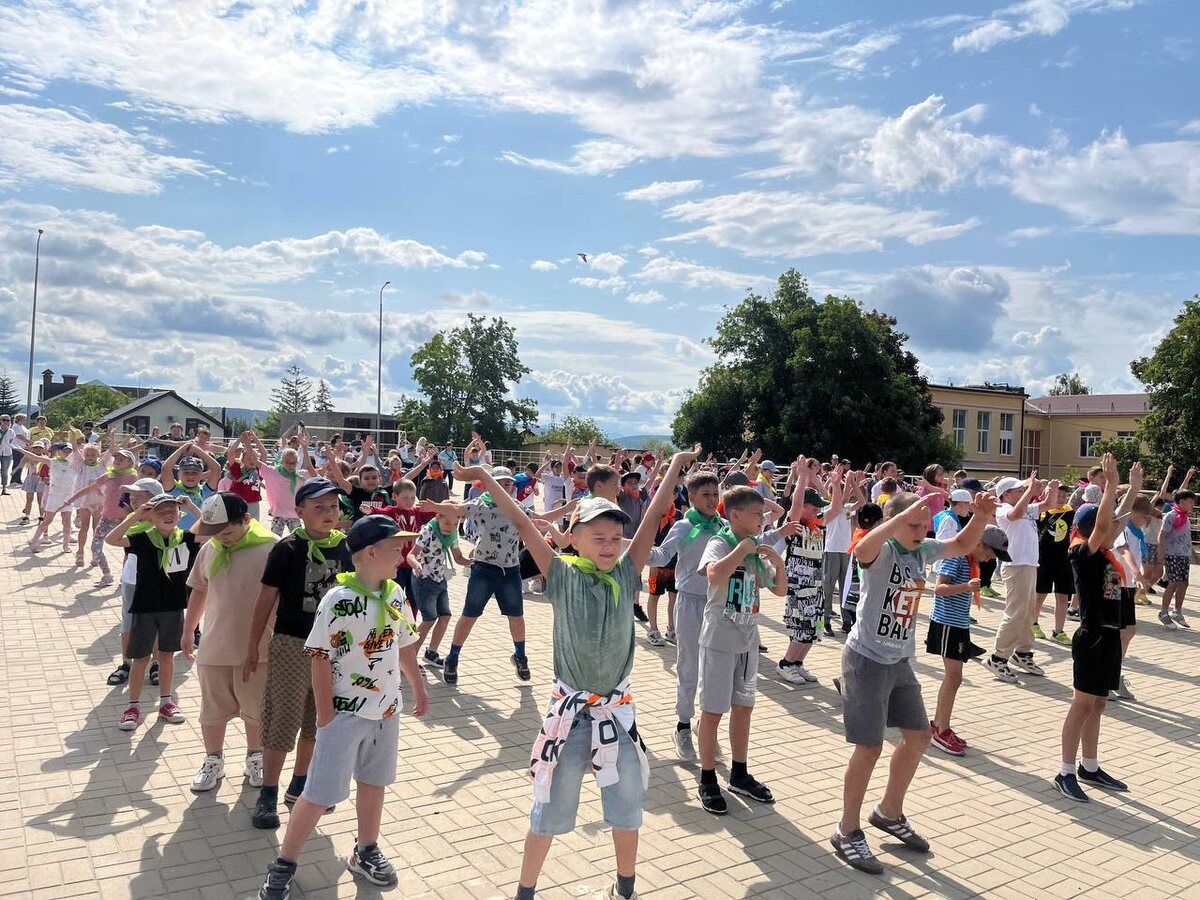 После зарядки на школьном плацу прошла торжественная линейка, где знаменная группа подняла государственные флаги, а все присутствующие исполнили гимны. Ведущие мероприятия поделились планами на день и напомнили ребятам о необходимости продолжать подготовку к предстоящему фестивалю танца.