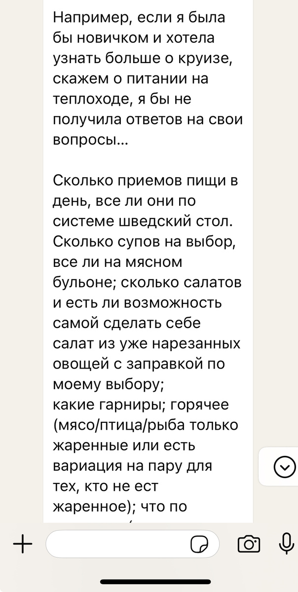 На мой обзор (ссылка на обзор в конце статьи) питания в круизе я получила гневное замечание «не умеешь писать - не берись!» 🤭. Мне сказали, что написала я «абсолютно не информативно, без ценности для туристов и не ответила даже на важные вопросы. И привели примеры вопросов. Ну раз надо, отвечу на эти вопросы подробнее, раз считают, что эти ответы очень важны для статьи о питании на круизе и помогут людям. Итак, мои ответы: 3.сколько салатов и есть ли возможность самой сделать себе салат из уже нарезанных овощей с заправкой по моему выбору? - три салата и свежие овощи. Салат можно составить, если только из вот этих ингредиентов: 4, какие гарниры? Гарнир обычно один, иногда два. Крупы или картофель. 5, горячее (мясо/птица/рыба только жаренные или есть вариация на пару для тех, кто не ест жаренное)? - чаще всего всё запеченное. 6, что по напиткам (что уже включено в стоимость (чай/кофе/вода/алкоголь и в каком количестве)? - из напитков чай в пакетиках и вода с долькой лимона или мят