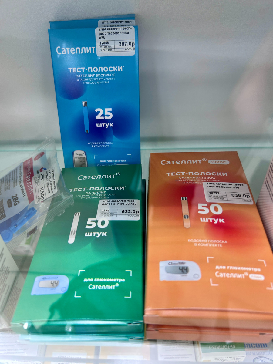 Зашла в считающуюся бюджетной аптеку в Москве. Решила посмотреть, сколько стоят самые дешевые тест-полоски, которые всегда таковыми были - для глюкометра Сателлит Экспресс (Онлайн).