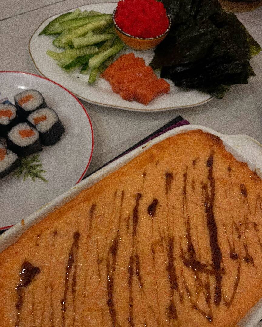 Для свежести огурчик тонко нарезанный и сделала Аля икру масаги (икру сельди или минтая залить 300 мл теплой воды и 5г красителя, на пару часов в холодильник, просушить на
